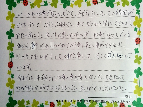 仕事で悩んでいることから、身も心も疲れていた事に気づくことができました。